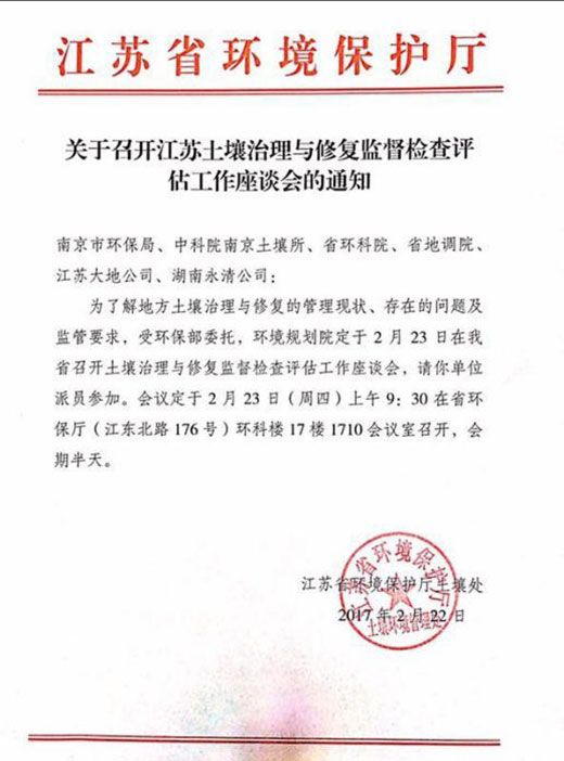 2017年2月23日,江蘇省環(huán)境保護(hù)廳土壤處邀請大地益源公司參加環(huán)保部環(huán)境規(guī)劃院在江蘇召開的“土壤治理與修復(fù)監(jiān)督檢查評估工作座談會”。總經(jīng)理辜曉平代表我公司出席會議并發(fā)言。
