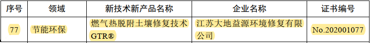 根據江蘇省新技術新產品推廣應用工作聯席會議辦公室7月23日公布的[2020]1號文件《關于印發省重點推廣應用的新技術新產品目錄(第二十三批)及公告目錄內有效新技術新產品名單的通知》,大地益源公司“原位熱脫附土壤修復技術(GTR®)”經專家評審論證,被列入省重點推廣應用的目錄(第二十三批),自公布之日起三年內有效。列入《目錄》的新技術產品是省重點組織推廣應用的對象,將優先享受省有關政策的支持。