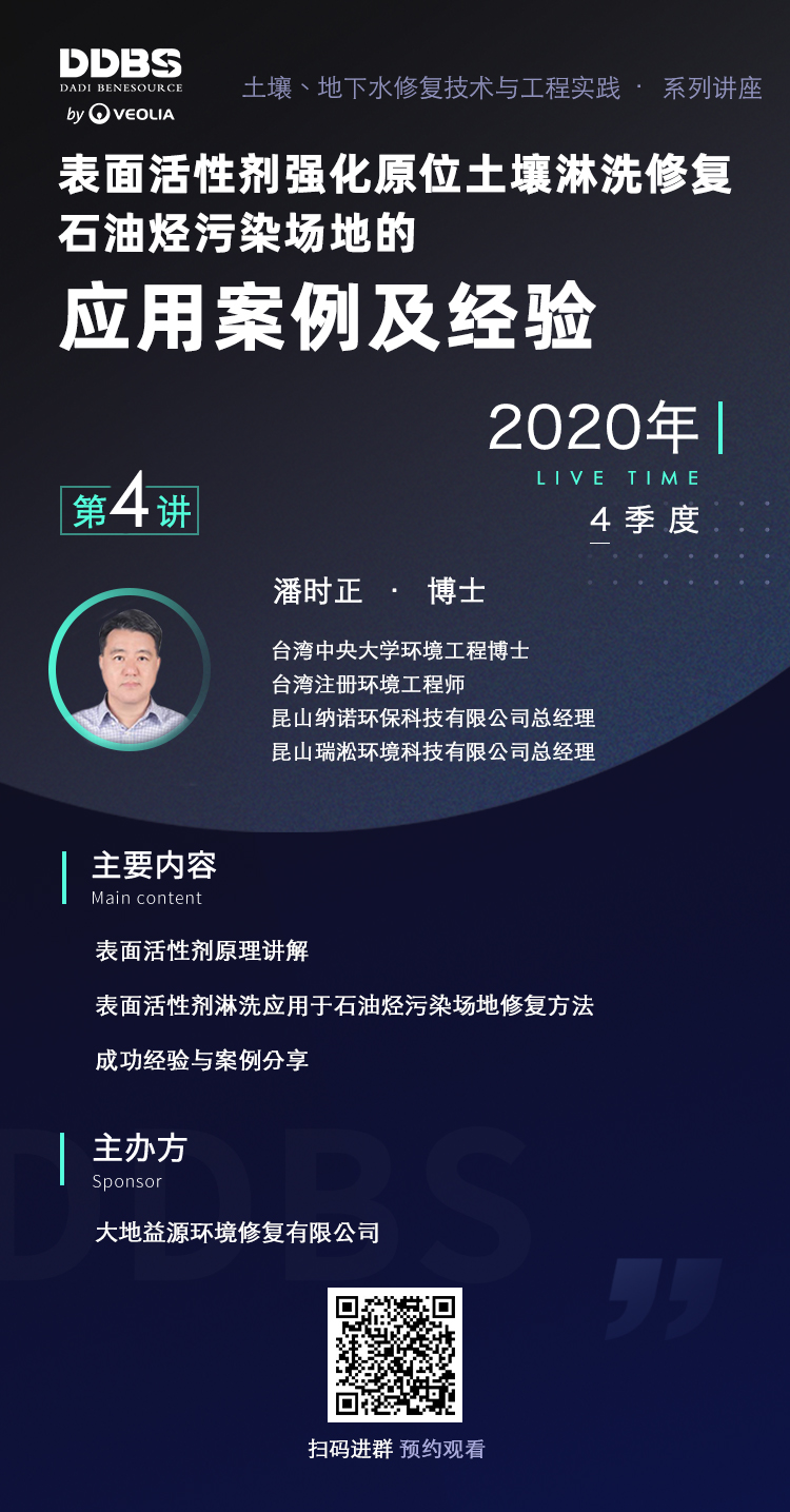 “DDBS在線系列講座”下期直播預計在今年4季度上線,將由臺灣中央大學環境工程博士潘時正為大家帶來《表面活性劑強化原位土壤淋洗修復石油烴污染場地的應用案例及經驗》課程。