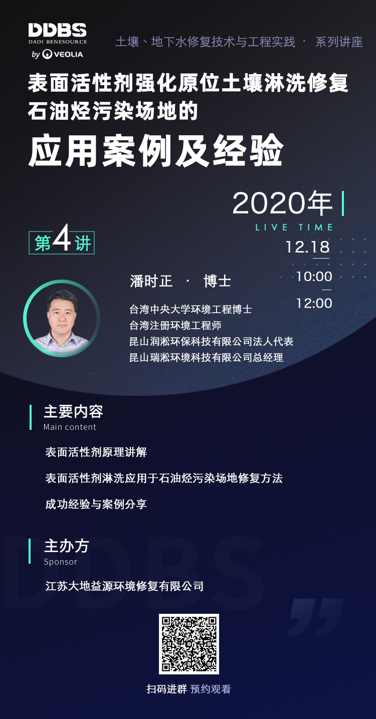 DDBS系列講座第四期,也是本年度的收官一期,由潘時正博士主講題為“表面活性劑強(qiáng)化原位土壤淋洗修復(fù)石油烴污染場地的應(yīng)用案例及經(jīng)驗(yàn)”的主題講座。