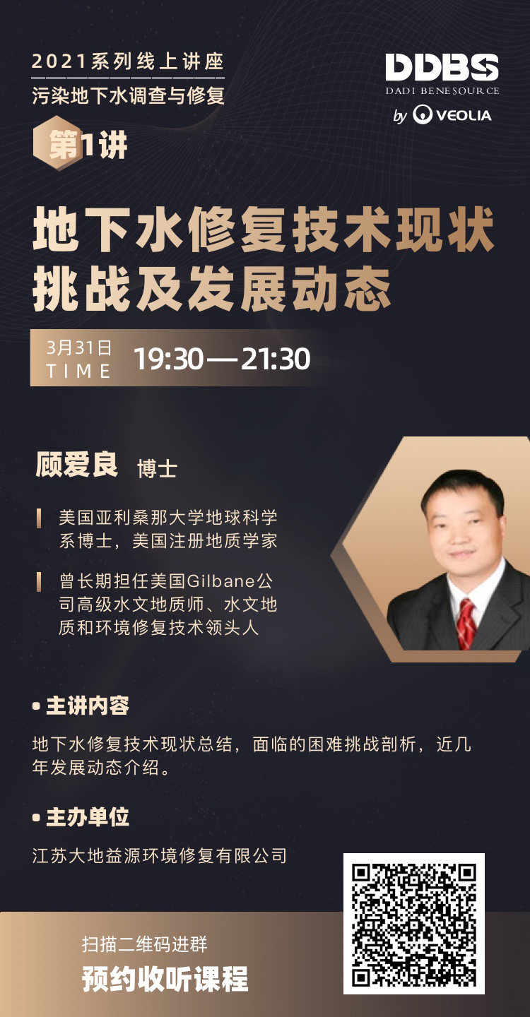2021年“DDBS在線系列講座”第一講,將邀請顧愛良博士帶來《地下水修復技術現狀、挑戰及發展動態》主題課程。