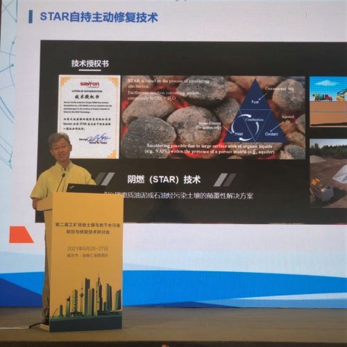 大地益源副總經理單輝峰博士受邀在研討會上作了《污染場地土壤-地下水綠色低碳原位修復技術應用》的專題報告,重點介紹了陰燃技術在土壤修復中的應用及發展前景。
