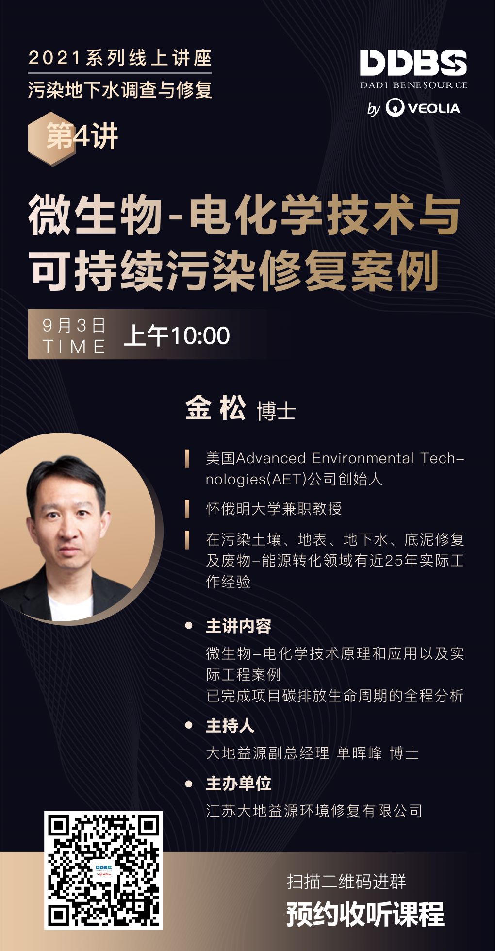 繼第三講成功舉辦后,第4講計劃將于9月4日與大家見面。第四講嘉賓我們特別邀請到金松博士,為大家帶來《微生物-電化學技術與可持續污染修復案例》講座。就微生物-電化學技術原理以及實際工程應用案例、已完成項目碳排放生命周期的全程分析等方面為大家進行授課。