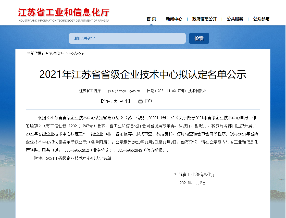 近日,江蘇省工業和信息化廳正式對外發布2021年江蘇省省級企業技術中心擬認定名單公示,大地益源被認定為2021年省級企業技術中心。
