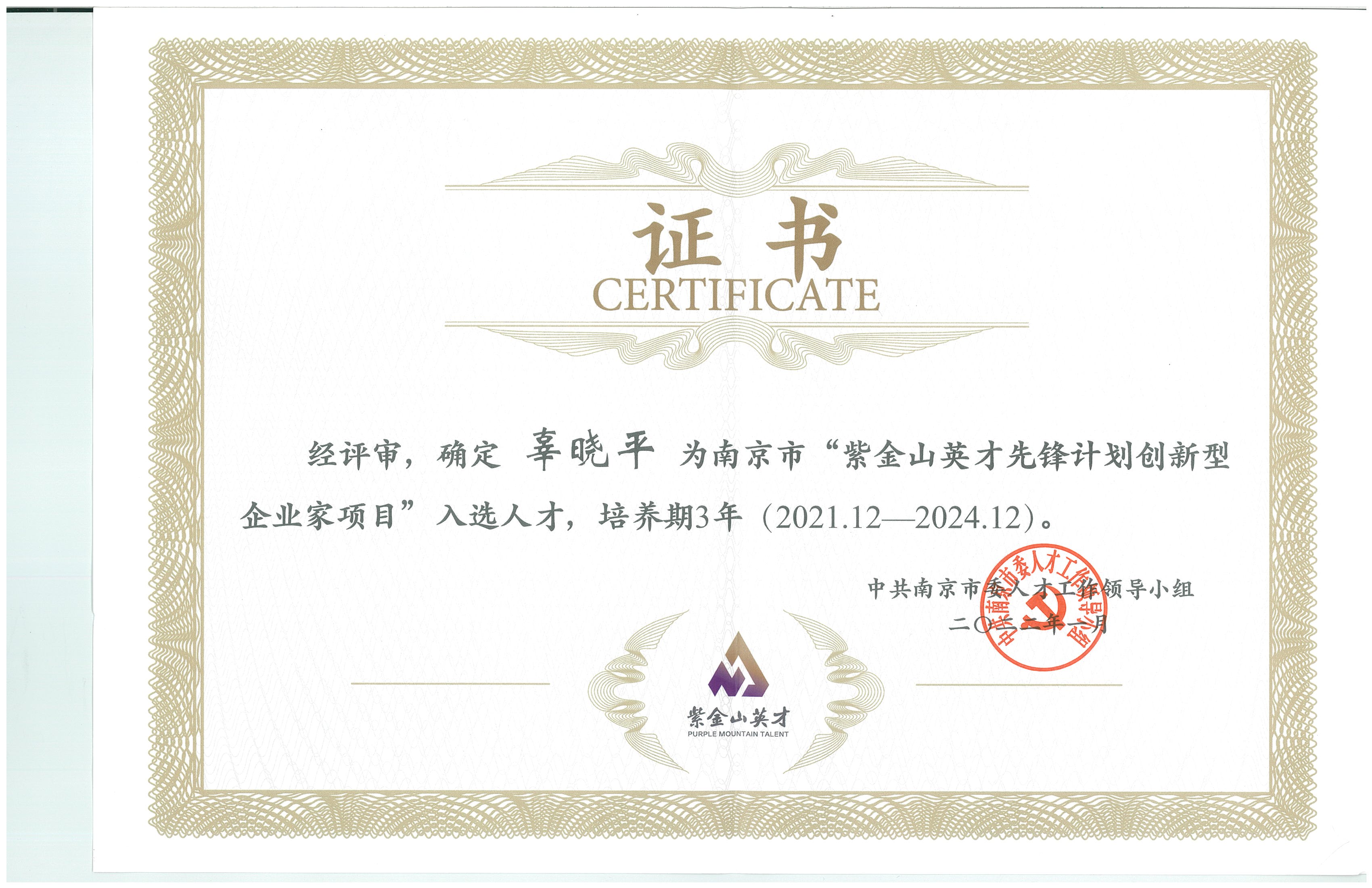 “紫金山英才計劃”,是在整合南京人才工程的基礎上,大力推進人才體制機制改革和政策創新,著力打造品牌統一、銜接有序、運作高效的人才支持體系?!白辖鹕接⒉畔蠕h計劃創新型企業家項目”入選名單由中共南京市委人才工作領導小組核準頒布,成功入選該計劃是對企業創新能力和經營管理能力的肯定和鼓勵。項目中創新型企業家指創辦創新型企業、具備高成長性和廣闊的市場前景、對產業發展起到引領作用的優秀企業家。