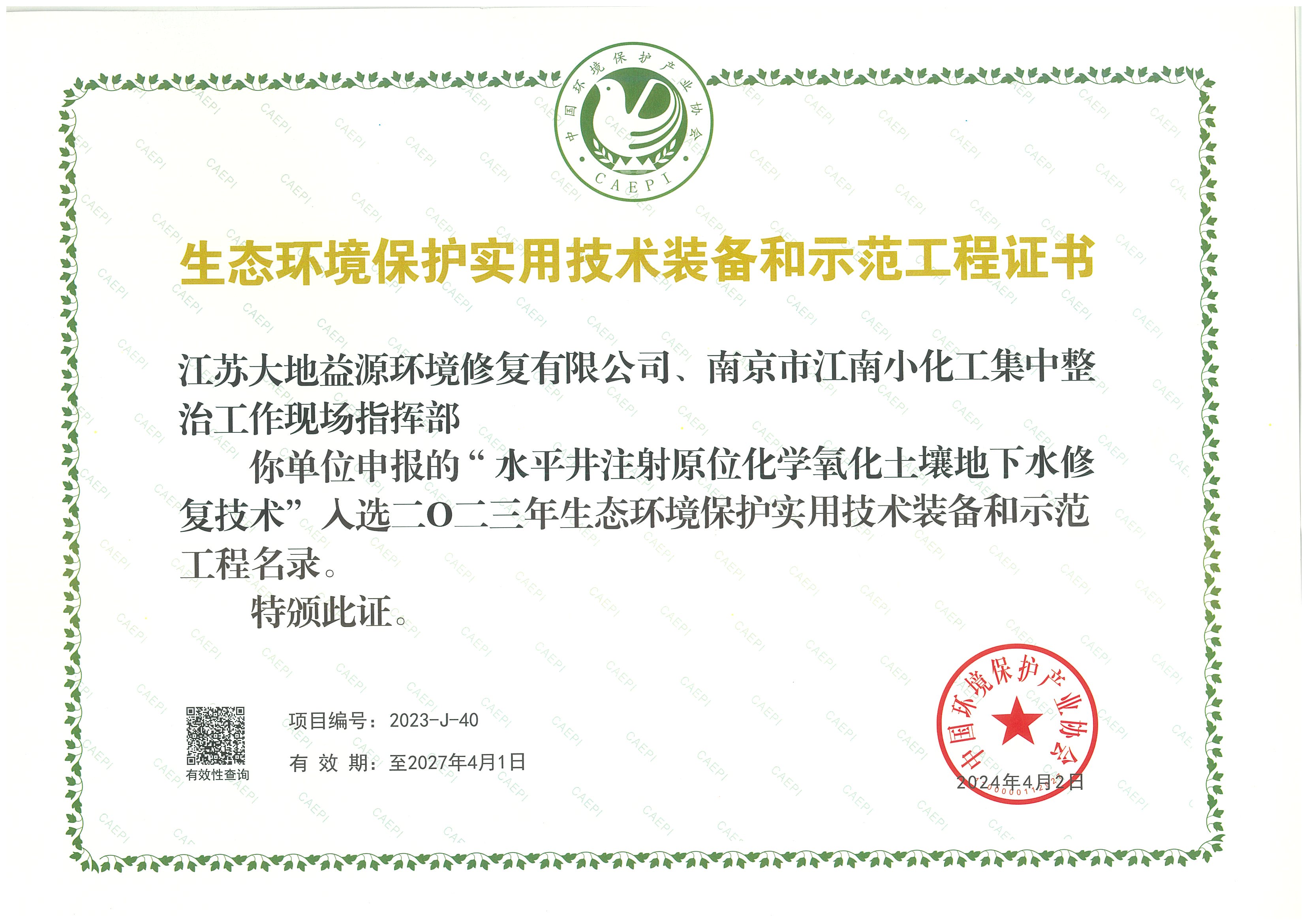 在環(huán)保技術(shù)方面,大地益源“水平井注射原位化學(xué)氧化土壤地下水修復(fù)技術(shù)”成功入選“2023年生態(tài)環(huán)境保護(hù)實用技術(shù)裝備和示范工程名錄”。