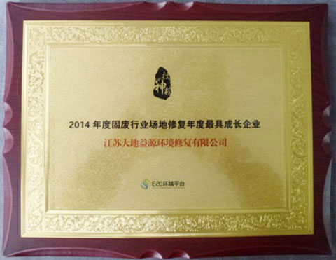 2014年12月13日,在2014固廢行業(yè)年度企業(yè)評(píng)選結(jié)果揭曉及頒獎(jiǎng)典禮上,江蘇大地益源環(huán)境修復(fù)有限公司被評(píng)為“2014年度中國固廢行業(yè)土壤修復(fù)領(lǐng)域年度領(lǐng)先企業(yè)(場地修復(fù)年度最具成長企業(yè))”。