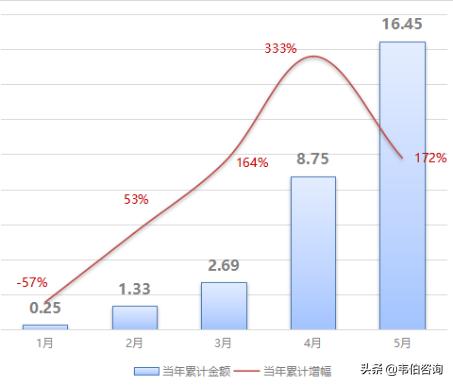 前五月全國土壤修復(fù)訂單金額累計達(dá)到16.45億元,同比大幅增長172%;單月累計同比增速分別為-57%、53%、164%、333%、172%,表明上半年市場呈現(xiàn)爆發(fā)之勢。