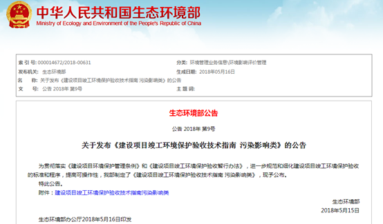 國家生態環境部發布《建設項目竣工環境保護驗收技術指南 污染影響類》公告,內容如下: 為貫徹落實《建設項目環境保護管理條例》和《建設項目竣工環境保護驗收暫行辦法》,進一步規范和細化建設項目竣工環境保護...