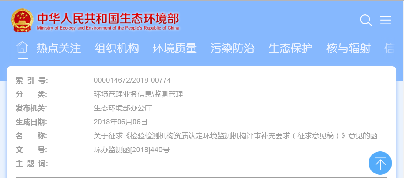 生態環境部辦公廳函環辦監測函[2018]440號關于征求《檢驗檢測機構資質認定環境監測機構評審補充要求(征求意見稿)》意見的函各省、自治區、直轄市環境保護廳(局),計劃單列市環境保護局,新疆生產建設兵...