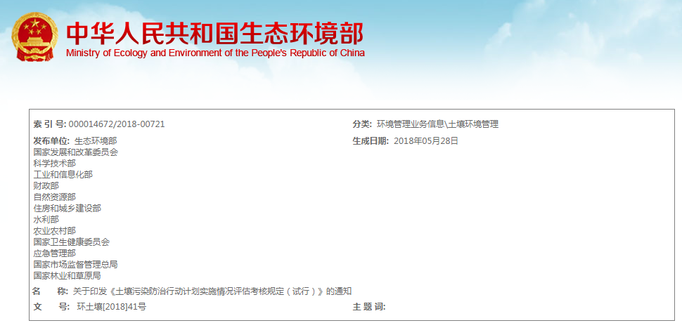 各省、自治區、直轄市人民政府: 按照《國務院關于印發土壤污染防治行動計劃的通知》(國發〔2016〕31號)要求,生態環境部會同國務院有關部門制定了《土壤污染防治行動計劃實施情況評估考核規定(試行)》...