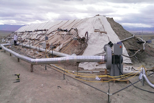 采用異位GTR ®修復(fù)技術(shù)對加州某場地的污染土壤進(jìn)行修復(fù)。目標(biāo)污染物是石油烴,最大濃度為31900mg/kg,平均濃度為9645mg/kg。修復(fù)土方量約20000立方米,每個(gè)土堆大小為124 x38 x 14英尺,休止角為大約40度。設(shè)置了36口加熱井,目標(biāo)加熱溫度為200℃,加熱45天達(dá)到<100mg/kg的修復(fù)目標(biāo),去除率大于90%。